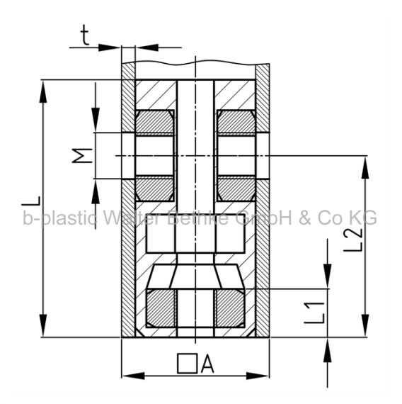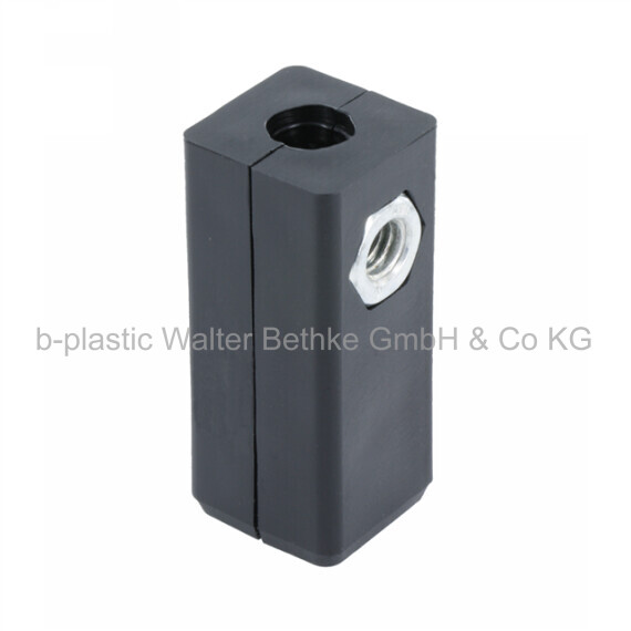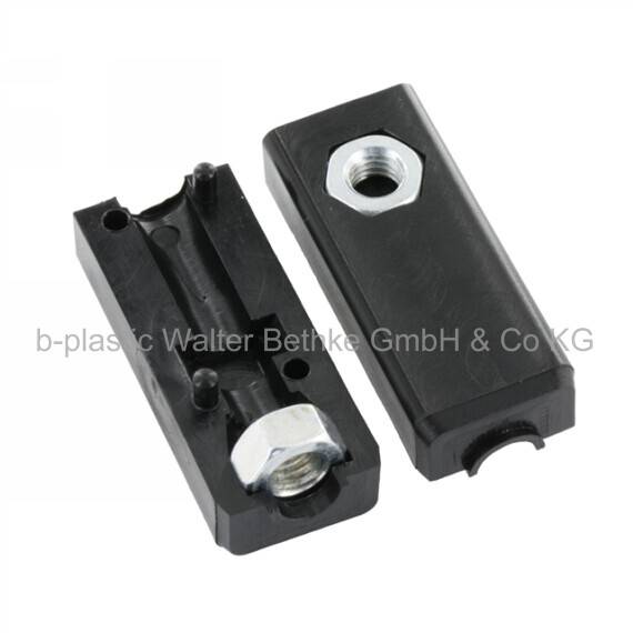 Schraub-Eckverbinder ohne Bund aus PA für Vierkantrohre, mit drei glanzverzinkten Sechskantmuttern