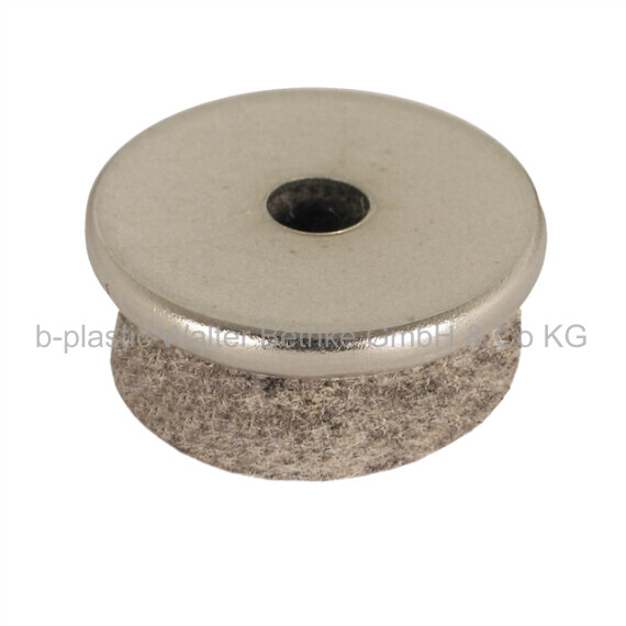 Round furniture glides with nickel-plated metal holder, felt sliding surface and fastening hole