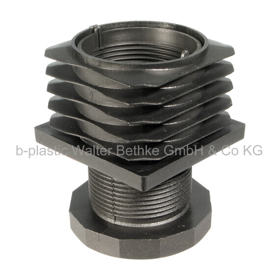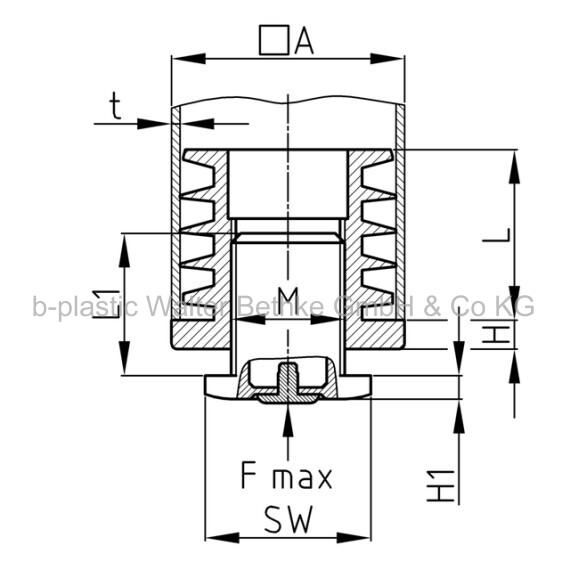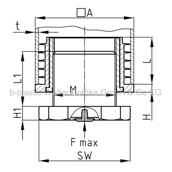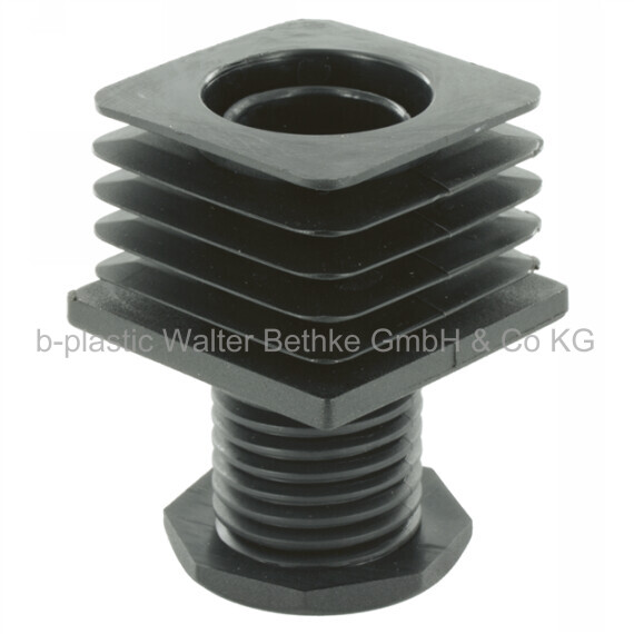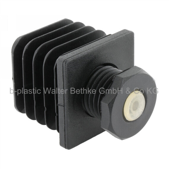 Adjusting plugs made of PA 6 for square tubes with anti-slip plug, one-piece outer body and injection moulded thread