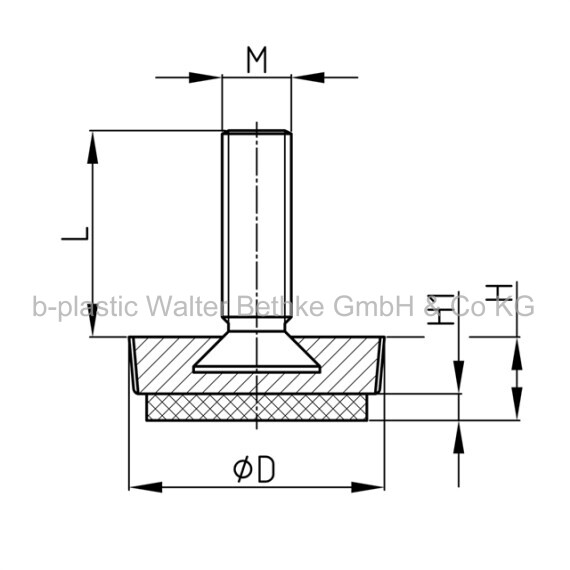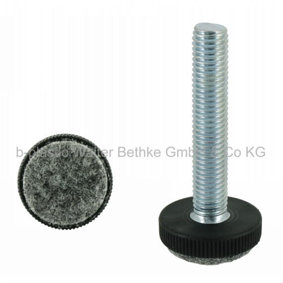 Adjusting screws with knurled plastic base made of PA, welded felt and overmoulded threaded bolt
