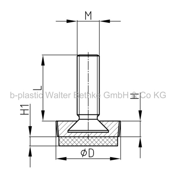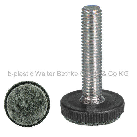 Adjusting screws with knurled plastic base made of PE, welded felt and overmoulded threaded bolt