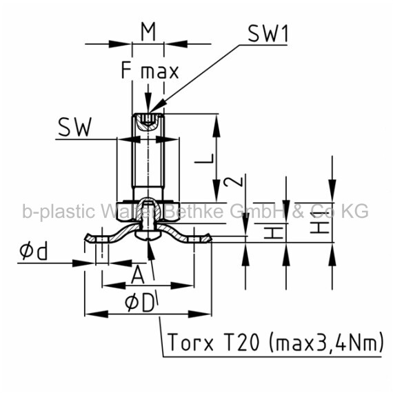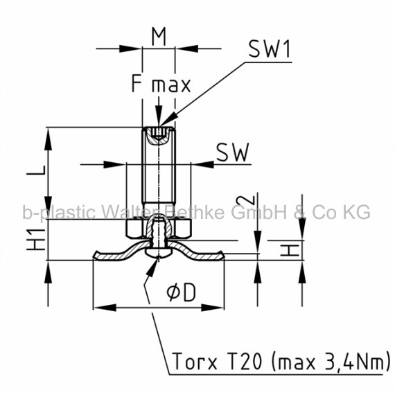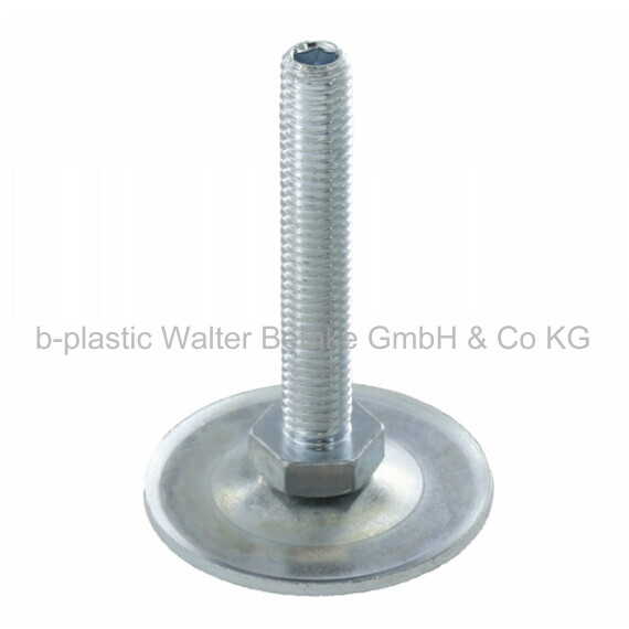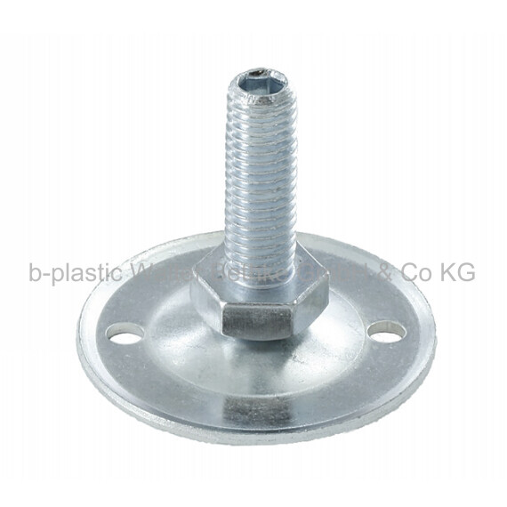 Adjustable feet made of galvanised steel with hexagonal adjusting screw and hexagon in the thread end, swivel base