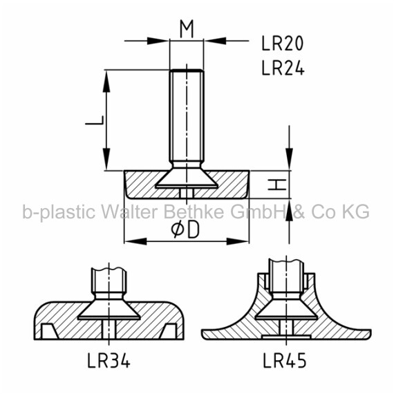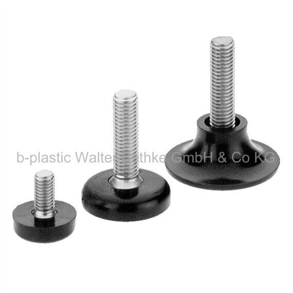 Adjusting screws with round plastic base made of PE, threaded bolt overmoulded