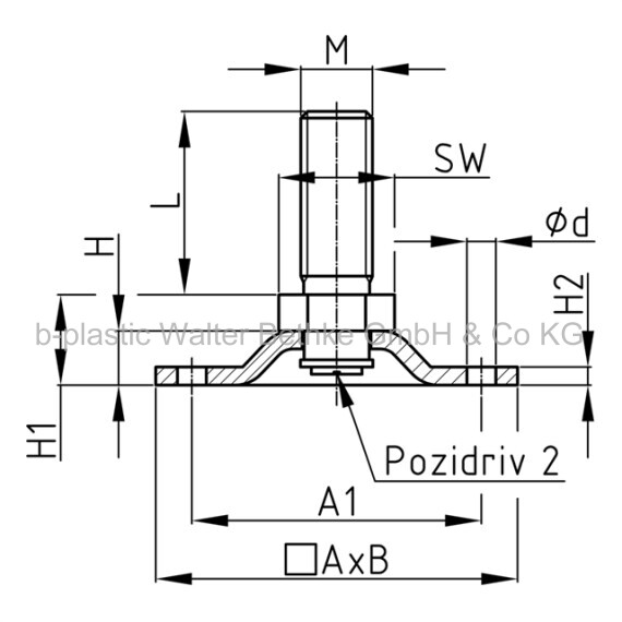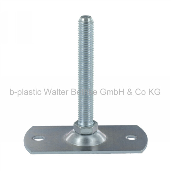 Rectangular adjustment feet made of galvanised steel with fixing holes and hexagonal adjustment screw, swivel base