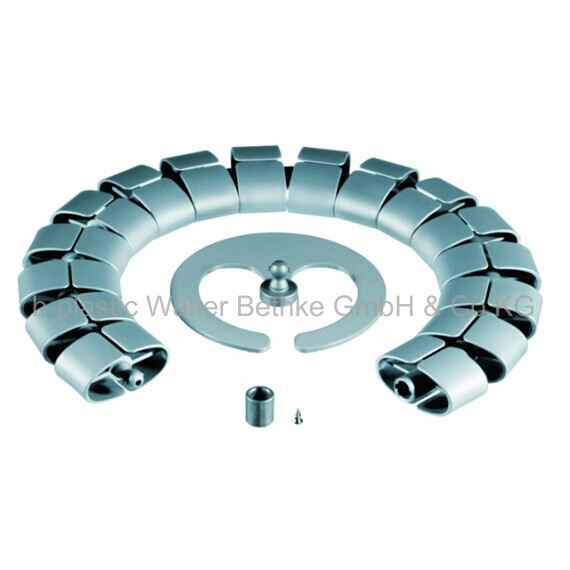 Oval cable chain set made of PP for cable feed to writing and working tables, including steel base plate and table mounting