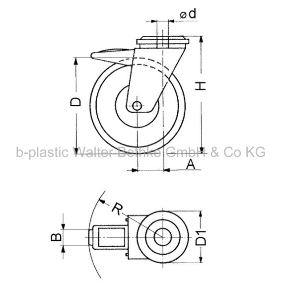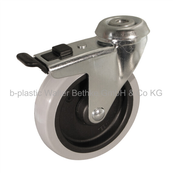 Swivel castors with bolt hole and wheel brake, wheel/axle riveted, plain bearing