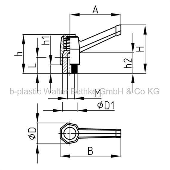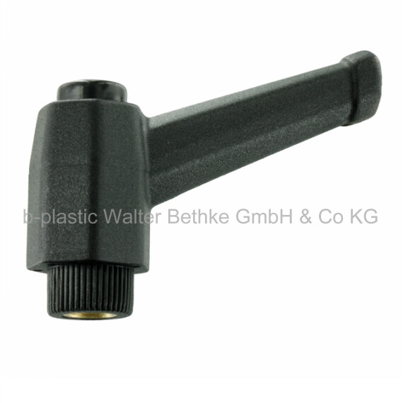 Clamping lever made of PA-GF with overmoulded brass threaded bush, adjustable with push button