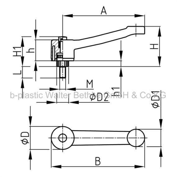 Clamping lever made of PA-GF with threaded bolt, adjustable with push button