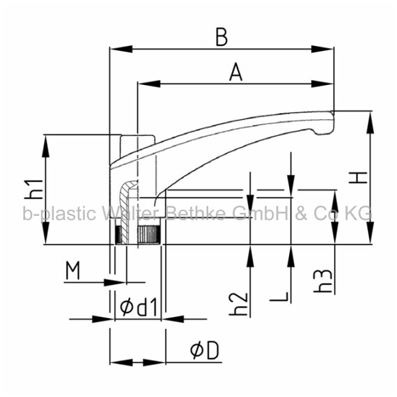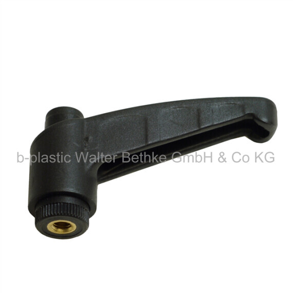 Clamping lever made of PA-GF with overmoulded brass threaded bush, adjustable with push button