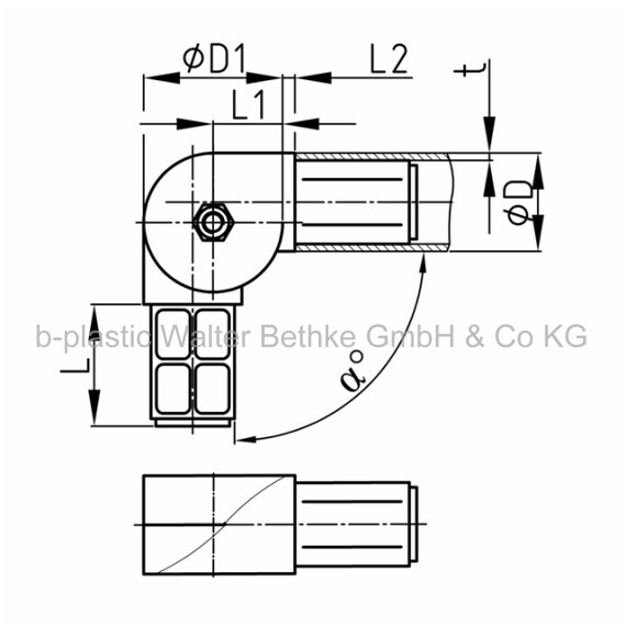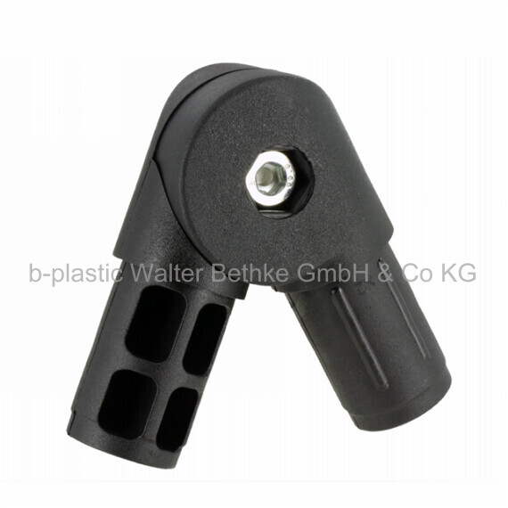 Two-way push-in connector made of PA 6.6 with joint for round tube