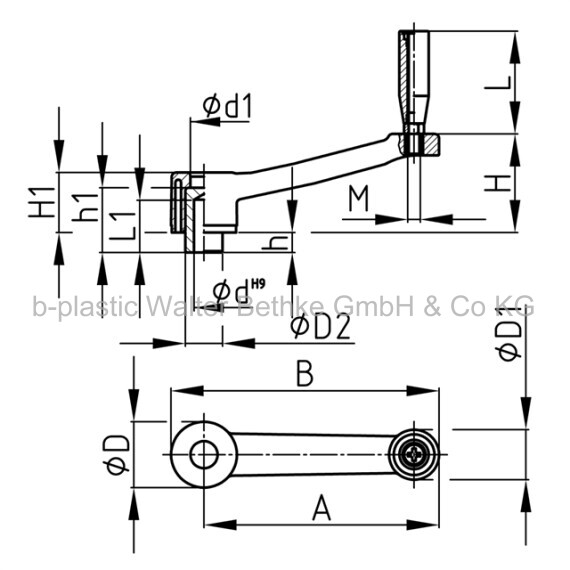 Crank-handle made of PA-GF with revolving handle, hub with blind hole