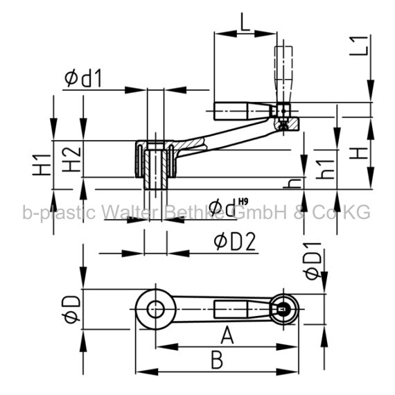 Crank handle made of PA-GF with folding handle, hub with through hole