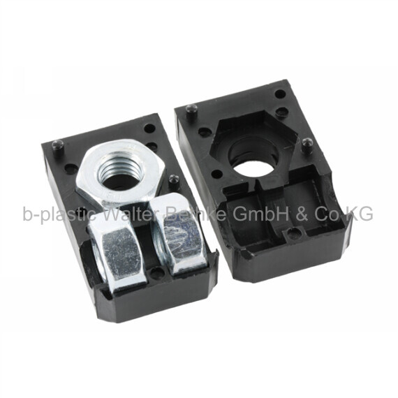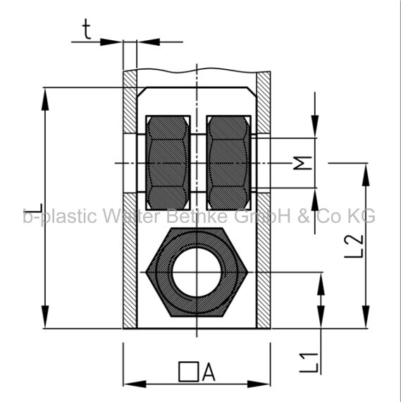 Screw corner connectors made of PA without collar for square tubes, with three bright galvanized hexagon nuts