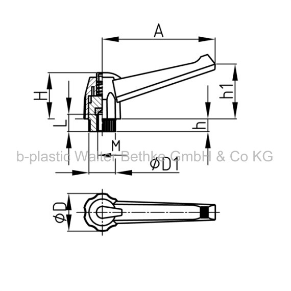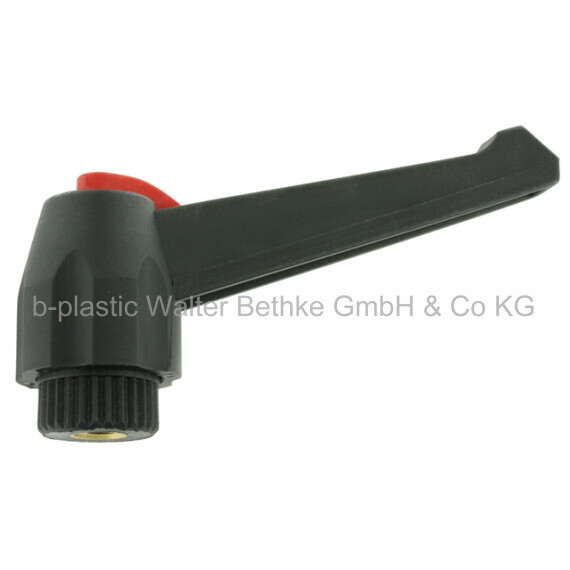 Clamping lever made of PA 6 with brass threaded bush, adjustable with push button