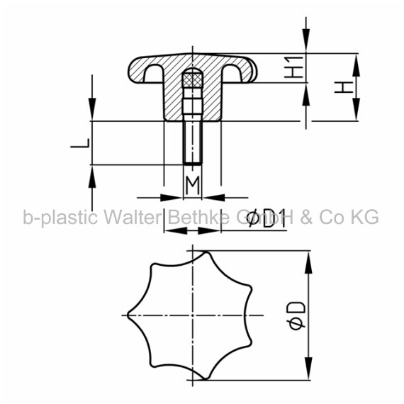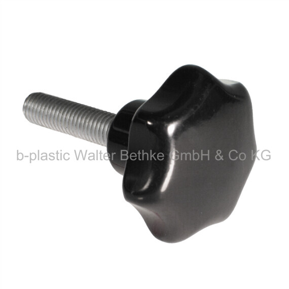 Bright polished star knobs (DIN 6336 L) made of thermosetting plastics with overmoulded threaded bolt