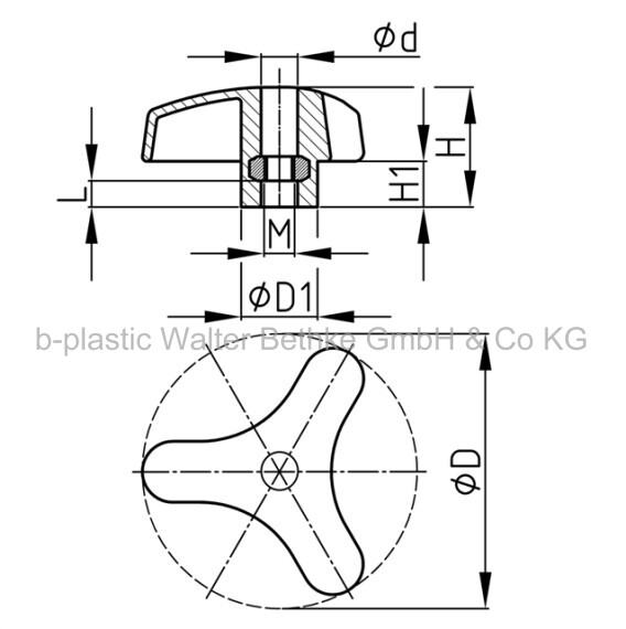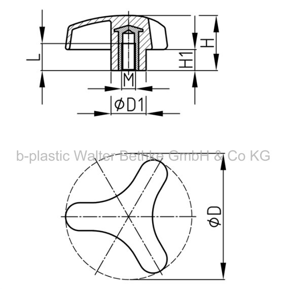 Three-star grips made of PP with overmoulded threaded bush or threaded nut