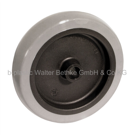 Wheels with elastic thermoplastic tread (75 - 100 mm) or polyurethane tread (50 mm), plain bearings